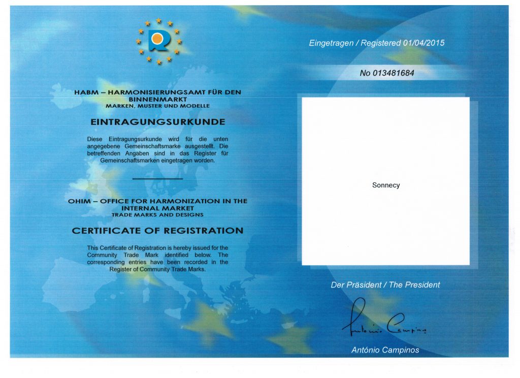 November 26, 2014: | Registration of the Chinese trade mark SONNECY by Chinese Company SONNECY Technologies (Shanghai) Co., Ltd. |